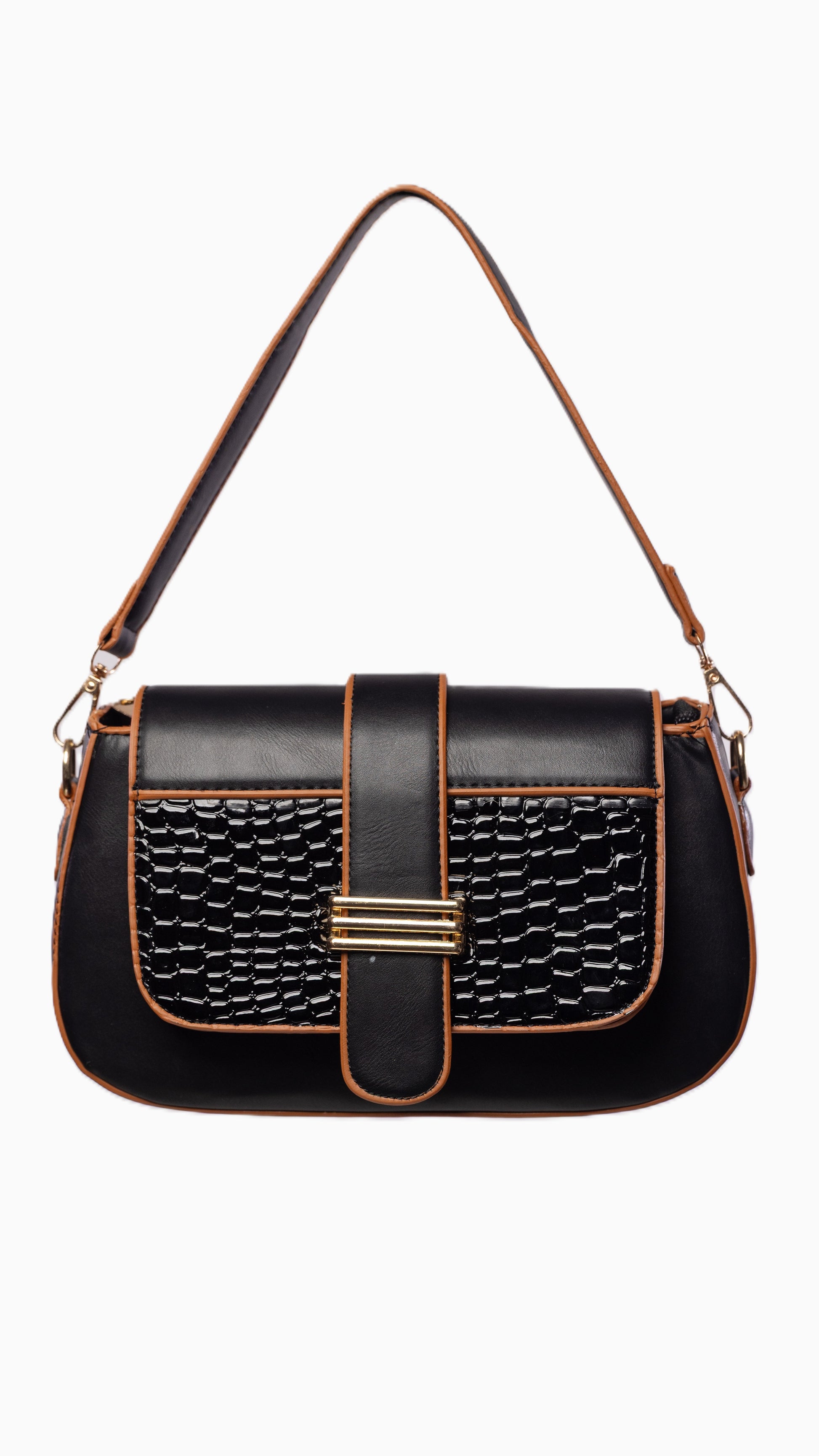 Sac Orta, Élégant et original, ce sac associe une surface lisse avec un rabat texturé effet reptile pour un style unique et sophistiqué. Son anse confortable permet un porté épaule tendance, tandis que ses finitions dorées ajoutent une note glamour. Parfait pour celles qui recherchent un accessoire pratique et distingué à la fois.